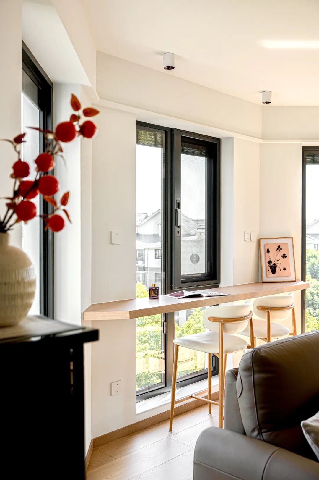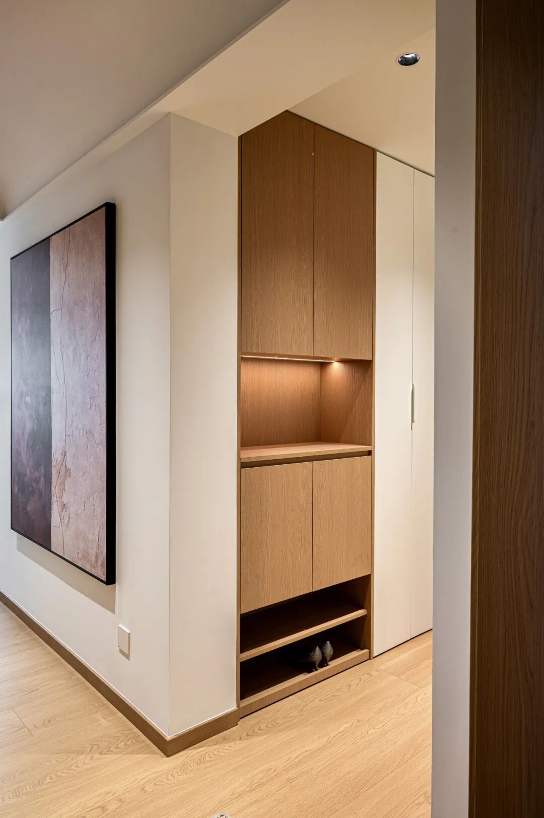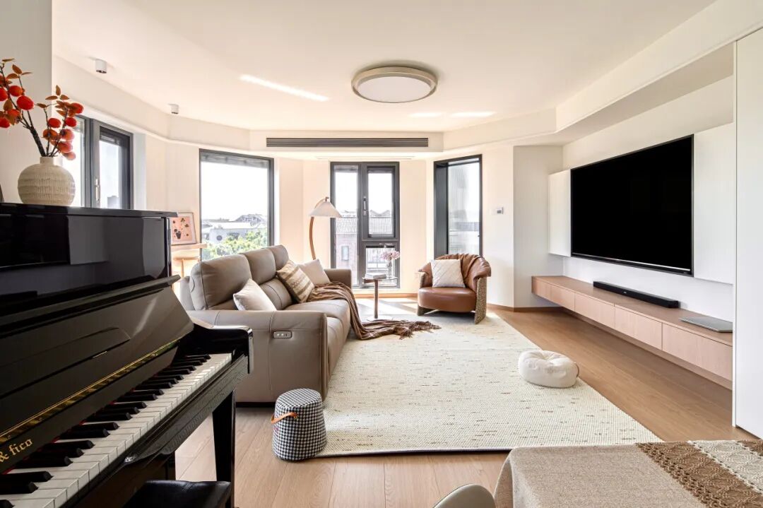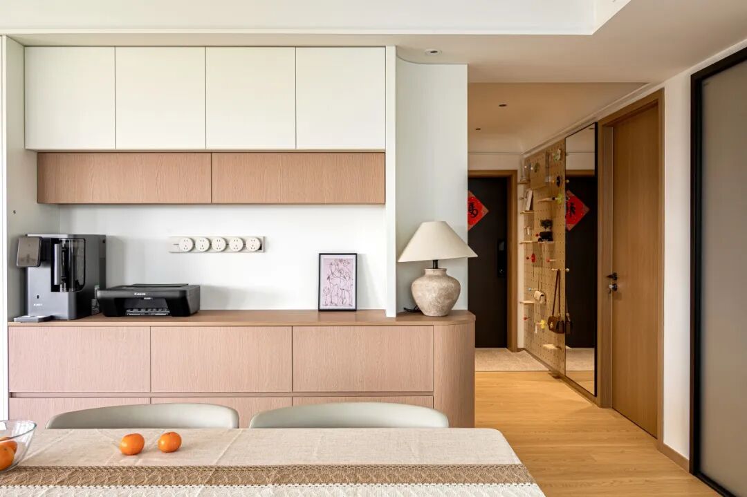一体化通透格局,消解空间边界,动线舒展流畅。温润米调基底糅合自然原木肌理,冷暖平衡,氛围感浑然天成。